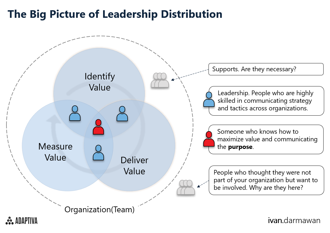 The overlapped area between the circles is the leadership area. The person icon in red is someone who knows how to maximize the value (I will talk about value more later), or simply the revenue.